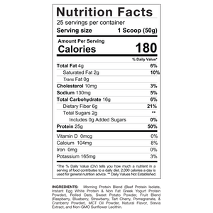 Morning Protein Blend combines Beef Protein Isolate, Instant Egg White Protein, and Non-Fat Greek Yogurt Protein Powder to provide a rich and balanced protein source for morning nutrition. This blend supports muscle growth, recovery, and sustained energy throughout the day.